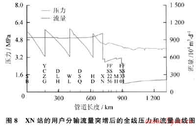 XN站的用戶分輸流量突增后的全線壓力和流量曲線圖如圖8所示。從圖8可以看出,當XN站的分輸氣量突然增加后,XN站上下游的壓力會有所下降,上游的流量會有所增加。