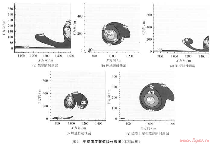 圖1為泄漏80s后甲烷濃度等值線分布。由圖可知:架空瞬時泄漏甲烷分布高濃度區擴散至(1450m,200m)高空,分布不規則;埋地瞬時泄漏則分布在(1000m,150m)高空,呈圓形區域,在泄漏口有小范圍高濃度區。架空持續泄漏與架空瞬時泄漏分布曲線相似,但持續泄漏高濃度區向右下偏移。埋地持續濃度分布呈對稱結構,高濃度區內存在左、右2個高濃度區,近地面存在長250m、高20m的扁長狀爆炸區。增大土壤孔隙度后近地面無爆炸危險,濃度分布與埋地瞬時相似,但濃度降低。