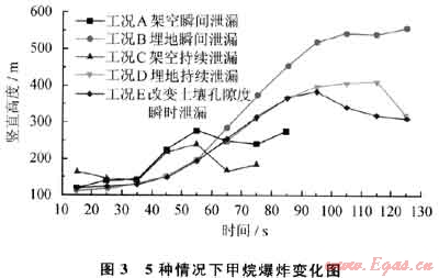 3) 管道泄漏爆炸范圍:埋地管道(工況B、D、E)泄漏爆炸范圍大且影響時間長,呈指數增加達到一定高度后不再升高,隨氣體擴散濃度減低至爆炸下限外;架空瞬間及持續泄漏爆炸范圍在85s前增加且高度比埋地管道泄漏高,85s后降低;孔隙度越大其影響范圍越小。