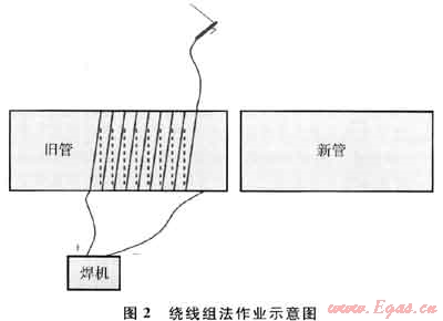 用直流電焊機的手焊鉗線在帶磁管道上順時針或反時針纏繞若干圈,纏繞匝數根據管道的磁場強弱決定,一般選用8~10圈為宜,其作業示意圖如圖2所示。繞線時如發現管口磁性變大,則需全部拆除,重新反向纏繞。