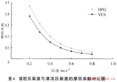 這種新型的溶液的結構具有良好的可逆性,當高剪切時,結構解體;剪切速率降低后,結構又重新恢復。采用自研環路實驗裝置測定的流動摩阻如圖4所示:在同等條件下VES壓裂液摩阻系數比胍膠壓裂液低,有利于降低施工摩阻減小施工壓力。