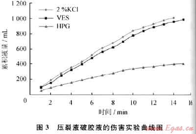 采用巖心流動實驗裝置評價該壓裂液對巖心的傷害,其狀況如圖3所示。胍膠壓裂液破膠液在通過API導流槽時,由于破膠液中存在殘渣,使累計體積隨時間的增長越來越慢,最后漸漸地趨向于零,傷害嚴重。而所研制的VES壓裂液破膠液通過API導流槽時,表現出了與2%KCl溶液相似的流動特性,該壓裂液對支撐裂縫帶的傷害非常小。