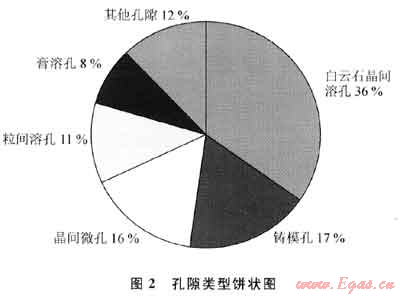 根據巖心鑄體薄片、電鏡掃描分析,Asmari組孔隙類型豐富多樣,以次生孔隙為主;原生孔隙極少,在成巖作用過程中幾乎破壞殆盡??紫吨饕獮橥砥谌芪g作用形成的白云石晶間溶孔、粒屑鑄模孔、粒間及粒內溶孔、膏溶孔或膏???。其中,白云石晶間溶孔,生屑、砂屑等碳酸鹽巖粒屑被溶蝕或選擇性溶蝕形成的鑄???、粒內或粒間溶孔以及膏溶孔等,分別占各類孔隙的36%;白云石、少量方解石的晶間微孔占16%;粒間孔、粒內孔、生屑體腔孔、殼壁孔等原生孔隙以及其他類型的孔隙僅占12%(圖2)。