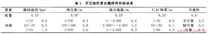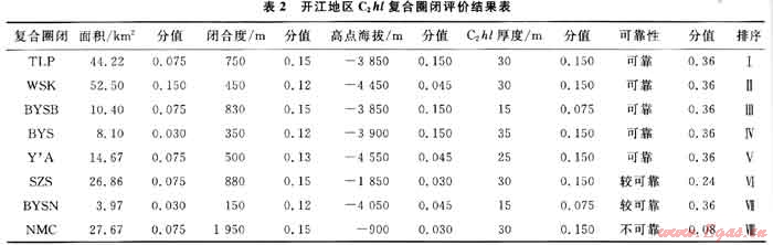 C2hl及其上、下巖層的組合是四川盆地多套生、儲蓋組合中較好的一套組合,經過多年的勘探也證實C2hl具有豐富的天然氣資源。結合已發現C2hl氣藏特征對已識別C2hl復合圈閉面積進行劃分,圈閉面積小于10km2的權值取0.2,圈閉面積大于50km2的取權值1.0,圈閉面積介于10~50km2的取權值0.5,圈閉面積評價系數權重為O.15(表1)。