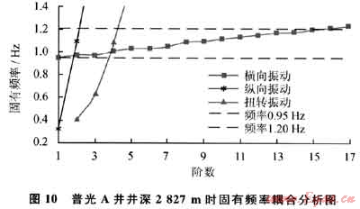 1) 鉆柱扭轉振動和縱向振動固有頻率數值較大,各階固有頻率之間間隔較大,可選擇的安全轉速范圍較寬;但橫向振動低階固有頻率數值很小且各階固有頻率之間間隔很小,可選擇的安全轉速范圍較窄。