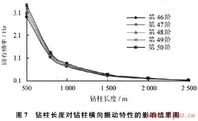 取固有頻率階數為第46~50時的固有頻率值比較,鉆柱長度對振動的影響計算結果如圖7所示。鉆柱長度增加,其橫向振動固有頻率明顯降低。鉆柱長度的變化對直井整體鉆柱橫向振動特性影響非常明顯。根據計算結果,把固有頻率轉換成轉速,整體鉆柱長度為500m時,其對應轉速在轉盤轉速60~70r/min的固有頻率有3階;鉆柱長度為800m時,有5階;鉆柱長度為1000m時,有7階;鉆柱長度為1500m時,有13階;鉆柱長度為2000m時,達16階;鉆柱長度為2500m時,共有20階之多。