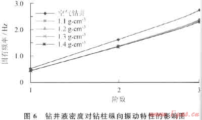 由于鉆井液的存在,鉆柱在進行軸向運動的時候,受到鉆井液的黏滯作用。根據鉆井液的流變特性,其密度越高,黏度越大,對鉆柱軸向運動的阻礙作用越明顯??梢?,鉆井液會對鉆柱縱向振動的固有頻率產生很大影響,改變縱向振動的臨界轉速,這種影響必須引起足夠的重視。