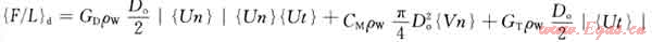式中{F/L}d表示由于液體動力效應引起的單位長度上的載荷;CD表示法向阻力系數;ρw表示外部液體的密度;Do表示管柱實際外徑;{Un}表示法向相對速度矢量;CM表示慣性系數;{Vn}表示法向加速度矢量;CT表示切向阻力系數;{Ut}表示切向上相對速度矢量。