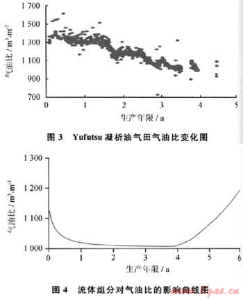 由于重力分離的作用,凝析氣藏在縱向上存在組分梯度,即隨深度的增加,凝析氣藏的組分會發生變化,流體變重。而某些凝析氣藏的組分梯度很明顯,如雅克拉和大澇壩凝析氣藏。而在對氣井進行射孔時,為了減小邊、底水的影響,一般選擇對儲層的上部進行射孔,這就造成氣井剛開始生產的凝析氣主要為深度較淺的流體,這些凝析氣相對于更深的凝析氣來說組分較輕,因此剛開始生產時的氣油比較高,而隨著開采的繼續,將采出更多的深層較重的凝析氣,這就造成生產氣油比的下降。