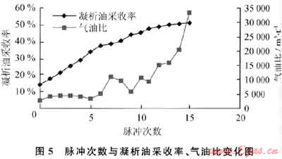圖5為脈沖次數與凝析油采收度、氣油比的變化關系,在31MPa開始進行脈沖注氣,雖然脈沖壓力波動范圍都是25%,但由于建立了單向流動通道,因此采收率相對較高,脈沖很多次后仍有一定油量采出,在進行15次脈沖時,油采出程度51.23%,增加凝析油采收率37.62%。說明在裂縫孔洞型碳酸鹽儲層中,建立注采循環系統后,有壓力脈沖可使部分凝析液得到反蒸發,從而比最大凝析油飽和度下注氣凝析油采收率提高了4%左右。