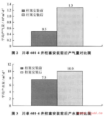 川孝601-4井施工前產氣0.5×104m3/d,產水7.5m3/d;施工后產氣1.3×104m3/d,產水10m3/d,增產天然氣0.8×104m3/d,排水采氣效果顯著。綜合采氣曲線可以看出:該井自安裝柱塞氣舉以來,油套壓差減小,產氣量顯著增加,排水采氣效果明顯。柱塞氣舉安裝前后產量對比如圖2、3所示,柱塞安裝前后綜合采氣曲線如圖4所示。
