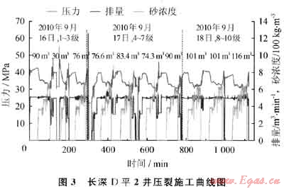 長深D平2井壓裂施工歷時3d,創造了中國石油壓裂史上的3項紀錄:①水平井深層氣井壓裂級數最多(10段);②單井總壓裂規模最大(838m3);③單級壓裂規模最大(116m3)(圖3)。