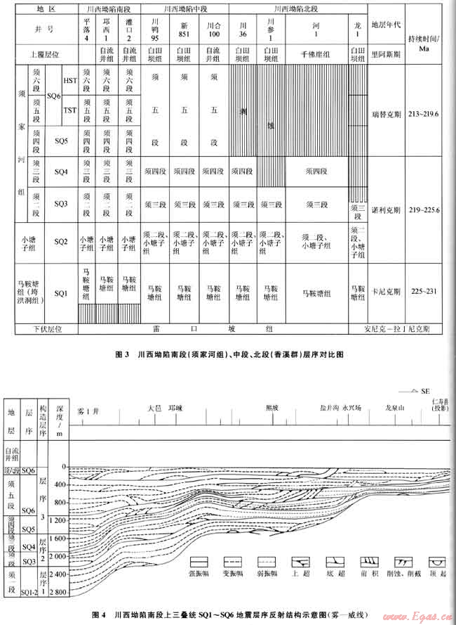 值得指出的是,大邑地區須三段底(即中國石化認為的T51界面)對下伏層的削截在大邑至灌口一帶十分明顯。由于龍門山構造帶從NE→SW逐次抬升,須六、須五段依次遭剝蝕。川西坳陷的北、中、南段SQ1~SQ6層序對比如圖3所示[6];展示坳陷的中段、北段各層序均可對比。
