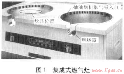近幾年來,市場上出現(xiàn)了一種集成式燃氣灶,這種燃氣灶最大的特點是,將抽油煙機煙氣吸入口與燃氣灶近距離地集成在一起,見圖1。集成式燃氣灶的抽油煙機煙氣吸入口呈環(huán)型分布在燃燒器頭部的側上方,從炊具的側面吸走煙氣。