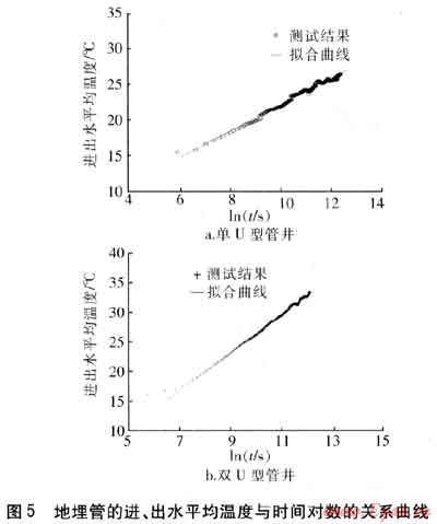 待地埋管進、出水溫差穩定后,擬合其平均溫度Tf與時間對數㏑t的關系曲線,見圖5。單U型管井擬合曲線公式為Tf=1.866 8㏑t+4.0142,雙U型管井擬合曲線公式為Tf=3.1964㏑t-5.5206,可得擬合曲線的斜率和截距。