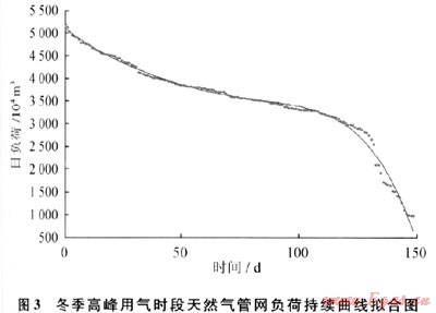 由圖2可知同一地區的天然氣管網負荷持續曲線具有相似性,為了研究極端天氣條件下的天然氣管網負荷特性,現取北京市2009年4月1日至2010年3月31日的天然氣管網負荷持續曲線,將夏季負荷截去后,留下冬季高峰用氣時段150d的負荷曲線,如圖3所示。對圖3中散點進行數值擬合得到擬合多項式[6]: