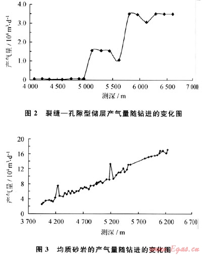 由于鉆遇裂縫和孔隙性基塊會有不同的產氣量顯示,根據隨鉆監測的產氣量隨著井深變化特征,可以準確判斷地層的介質類型及其供氣能力。圖2為鉆遇裂縫孔隙型儲層時的產氣隨鉆進變化規律,其氣體產量是隨每鉆遇一個裂縫(組)而上升一個臺階;圖3為鉆遇均質砂巖型儲層時的產氣隨鉆進變化規律,其產氣量與鉆進深度幾乎呈直線變化關系。