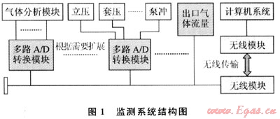 該系統采用分布式信號采集、集中式數據計算處理體系結構,如圖1所示。系統中大部分傳感器都是模擬量信號輸出,包括氣體組分、濃度、泵沖、立壓、套壓等傳感器,通過組合式多路A/D轉換模塊對其進行遠程實時信號采集處理和控制。其他以數字信號輸出的傳感器則直接連接A/D轉換模塊的輸出總線并與主計算機系統進行數字化信號傳輸。A/D轉換模塊輸出的總線信號通過無線收發模塊與主計算機系統進行無線傳輸,減輕了在復雜的井場環境中布線的工作量。根據實際情況,系統可以增加A/D模塊和各種不同類型的傳感器來滿足測量與監控的需要。