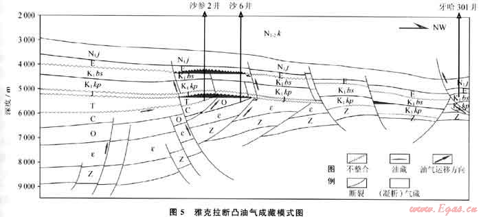 下白堊統沉積后,在下伏古生界侵蝕斷塊殘丘控制下,經燕山晚期-喜山早期運動改造形成背斜圈閉,該區及臨區古生界烴源巖在海西晚期-燕山晚期成熟的油氣沿不整合面側向運移,聚集于當時區域構造高部位——雅克拉斷凸帶;而燕山晚期輪臺斷裂的逆沖活動使油氣能夠繼續向上運移至白堊系圈閉,但由于當時缺乏封蓋條件,油氣全部逸散,僅殘存少量瀝青。