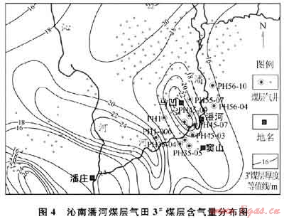 垂向上,下部15#煤層的含氣量明顯高于上部的3#煤層;平面上,3#煤層含氣量介于8~24m3/t,如圖4所示,以竇山東北、潘河口、馬凹為中心分別形成3個煤層氣富集區,含氣量高達24m3/t,在潘河先導性試驗區內主要以潘河口為中心形成高含氣量區,向外圍逐漸降低,在試驗區的西北及西南方向先降低,后又逐步增高。