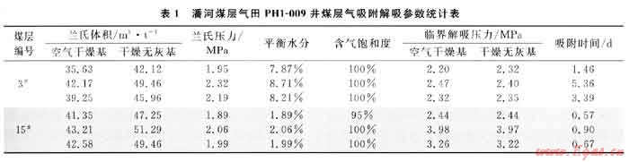 PH1-009井等溫吸附實驗溫度采用儲層溫度,平衡水分條件,測試結果表明,區內3#、15#煤層對甲烷具有很強的吸附能力。如表1所示,3#煤層蘭氏體積介于35.63~42.17m3/t,平均為39.02m3/t,蘭氏壓力介于1.95~2.32MPa;15#煤層蘭氏體積介于41.35~43.21m3/t,蘭氏壓力介于1.89~2.06MPa。15#煤層吸附能力高于3#煤層。吸附時間,3#煤層為3.39d,15#煤層為0.67d。煤層含氣飽和度均很高,除15#煤層的一個樣品為95%外,其余都是100%。