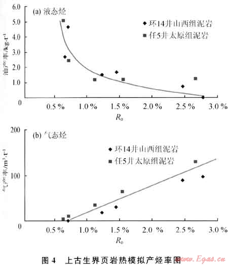鄂爾多斯盆地環14井山西組頁巖和任5井太原組頁巖的熱模擬實驗結果表明(圖4):Ro<0.7%時,幾乎沒有氣態烴產出;Ro介于0.7%~1.1%時,液態烴產率隨Ro增大迅速下降,而氣態烴產率則迅速增大,但產率數值還很??;Ro>1.1%時,液態烴產率隨Ro增大緩慢下降,而氣態烴產率隨R,增大迅速增大;Ro為2.5%時的氣態烴產率達到110m3/t(有機碳)。從該區上古生界頁巖的Ro大都超過1.1%可見,上古生界頁巖以生成氣態烴為主,僅有少量液態烴。