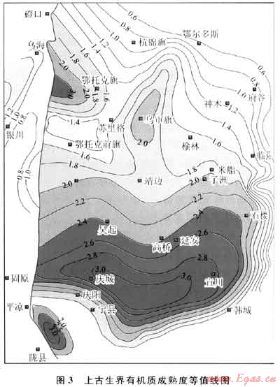 鄂爾多斯盆地上古生界地層的Ro集中在1.1%~2.5%,大部分處于高成熟階段,其Ro等值線圖顯示出(圖3),慶城-宜川一帶熱演化程度最高,Ro達到3.0%;烏審旗一帶Ro約為2.0%,鄂托克旗地區局部Ro最高達3.0%。除東北部杭錦旗 鄂爾多斯-府谷一線以外、東南部大荔向外、西南部固原以西等盆地邊緣地區,上古生界地層絕大部分地區Ro均超過1.1%,達到了形成頁巖氣藏的成熟度標準。其中榆林地區Ro介于1.1%~2.5%,處于有利于生成頁巖氣的成熟度范圍內。