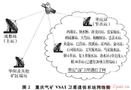 3) 對于新納入到重慶輸氣管網SCADA系統進行監控的站場(如地處偏遠且公網難以到達的重要站場)采用VSAT衛星系統數據傳輸電路作為重慶輸氣管網SCADA系統數據傳輸主通道,GPRS數據傳輸作為SCADA系統備用數據傳輸通道。重慶氣礦VSAT衛星通信系統網絡圖如圖2所示。