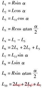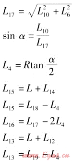 把已知條件代入計(jì)算公式,可以求得唯一的管道轉(zhuǎn)角α、兩個(gè)轉(zhuǎn)角之間直線段的長(zhǎng)度L16、兩個(gè)轉(zhuǎn)角端頭的直管段長(zhǎng)度L13、L15。