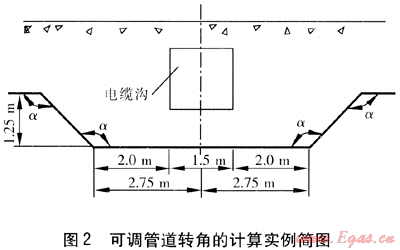 下面舉一個(gè)工程實(shí)例。在燃?xì)夤艿赖目v斷圖設(shè)計(jì)中遇到一處電纜溝,采用可調(diào)管道轉(zhuǎn)角的計(jì)算方法進(jìn)行計(jì)算,可調(diào)管道轉(zhuǎn)角的計(jì)算實(shí)例簡(jiǎn)圖見圖2。
