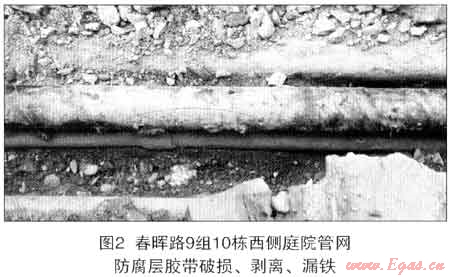 按照SY/T0087—95《鋼質(zhì)管道及儲(chǔ)罐腐蝕與防護(hù)調(diào)查方法標(biāo)準(zhǔn)》,破損缺陷≥8處/1Okm鋼質(zhì)管網(wǎng)評(píng)級(jí)為“差”。在公司長(zhǎng)達(dá)130km埋地鋼質(zhì)管網(wǎng)中,共檢出防腐層破損缺陷303處,超過(guò)23處/km,顯然管道防腐層屬“差”的等級(jí)。開(kāi)挖發(fā)現(xiàn)防腐層缺陷包括以下幾種形態(tài):(1)施工時(shí)未防腐;(2)施工時(shí)創(chuàng)傷(包括點(diǎn)狀和帶狀),此種情形占據(jù)了大部分,觸目驚心(見(jiàn)圖2);(3)防腐層經(jīng)長(zhǎng)時(shí)間浸水起泡;(4)管線(xiàn)彎又、三通、四通等部位防腐施工質(zhì)量差;(5)入戶(hù)管線(xiàn)出土處腐蝕較普遍。防腐層缺陷處管道本體腐蝕包括點(diǎn)狀腐蝕和面狀腐蝕,其中以點(diǎn)狀腐蝕危害為重,嚴(yán)重處已穿孔漏氣。