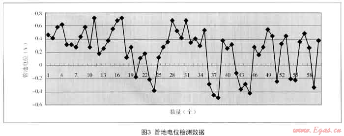 對(duì)整體管道的自然電位測(cè)試和原犧牲陽(yáng)極保護(hù)系統(tǒng)進(jìn)行測(cè)試,大部分管道處在自然腐蝕電位狀態(tài)(-0.45v,Cu/CuS04參比電極),所測(cè)的60處管地電位在-0.49V~-0.72V之間波動(dòng)(見(jiàn)圖3),其中正值占77%,最負(fù)值-0.49V,達(dá)不到管道陰極保護(hù)電位(即管/地界面極化電位)要求的-0.85V,即管道運(yùn)行沒(méi)有處于陰極保護(hù)狀態(tài)。
