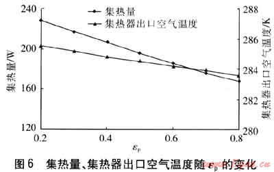 保持其他參數不變,集熱量、集熱器出口空氣溫度隨εp的變化見圖6。由圖6可知,隨著εp增大,吸熱板對環境的輻射傳熱增強,熱損失增大,集熱量降低。由于吸熱板溫度降低,與空氣的對流傳熱減弱,因此集熱器出口空氣溫度降低。集熱量與集熱器出口空氣溫度降低的趨勢逐漸減緩,這是由于隨著吸熱板溫度的降低,熱損失的增長率也大大降低。