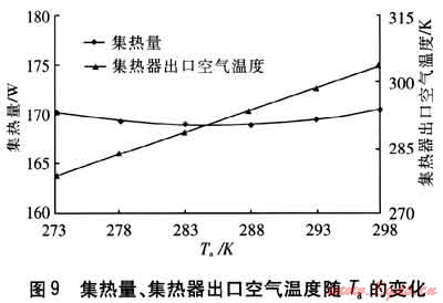 保持其他參數不變,集熱量、集熱器出口空氣溫度隨Ta的變化見圖9。由圖9可知,Ta增大,即集熱器進口空氣溫度增大,則集熱器出口空氣溫度相應升高。