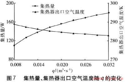 保持其他參數不變,集熱量、集熱器出口空氣溫度隨q的變化見圖7。由圖7可知,隨著q的增大,集熱器出口空氣溫度降低,這是由于q的增大易導致空氣穿過吸熱板的時間和在集熱器內部流動的時間縮短,影響了換熱效果。然而,集熱量一方面取決于集熱器出口空氣溫度與環境溫度之差,另一方面取決于q。由圖7可知,當q增大時,集熱器出口空氣溫度降低幅度較小,此時q成為影響集熱量的決定因素。因此隨q的增大,集熱量逐漸升高。但在集熱器出口空氣溫度逐漸減小的影響下,集熱量的增長速率是逐漸減緩的。