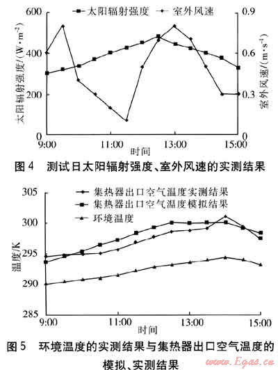 選取2009年10月初天氣晴好的一天作為測試日,測試時間為9:00—15:00。測試日太陽輻射強度、室外風速的實測結果見圖4。環境溫度的實測結果與集熱器出口空氣溫度的模擬、實測結果見圖5。