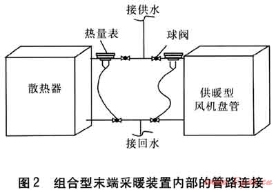 實驗室1窗戶下面的散熱器管路上裝有熱量表、球閥及供暖型風機盤管。設備連接見圖2,維持基礎室溫的散熱器和風機盤管并聯。