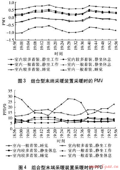 在實驗室1中,采用組合型末端采暖裝置進行采暖,開啟供暖型風機盤管的風機中檔后進行測試。當CLO=1.0時,當人員靜坐休息時,PMV的平均值為0.31,PPD的平均值為7.26%,滿足IS0 7730—2005對可接受熱環境的規定,即室內熱環境滿足大部分人的舒適要求。靜坐工作時,PMV的平均值為0.63,PPD的平均值為13.38%,人們需將較多著裝變為一般著裝(CLO=0.7)。變為一般著裝后,靜坐工作時PMV的平均值為0.28,PPD的平均值為6.87%;靜坐休息時PMV的平均值為-0.04,PPD的平均值為5.20%。此時靜坐工作和靜坐休息時的熱環境均符合IS0 7730—2005對可接受熱環境的規定。可見采用組合型末端采暖裝置采暖,既符合人們的日常行為習慣,又提升了人們的生活品質。通過對幾年實測數據的分析,建議采用組合型末端采暖裝置時,在進行維持基礎室溫所需的散熱器面積計算時,散熱器的散熱量宜取該房間室內采暖設計熱負荷的40%。組合型末端采暖裝置采暖時的PMV、PPD分別見圖3、4。