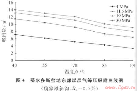 已有研究與實驗表明,煤層氣主要通過范德華力以吸附狀態(tài)存在于煤的內表面,等溫條件下,吸附量隨儲層壓力的增大而增大[1~3];然而,煤層氣的吸附量同樣受到儲層溫度的控制,并隨溫度的升高而減少。實際上,煤層在地層條件下對甲烷的吸附能力主要體現(xiàn)為儲層壓力、溫度的雙重作用,即隨埋深增大、儲層壓力增大帶來的煤層氣吸附量增大與儲層溫度升高帶來的煤層氣吸附量減小的綜合作用結果。