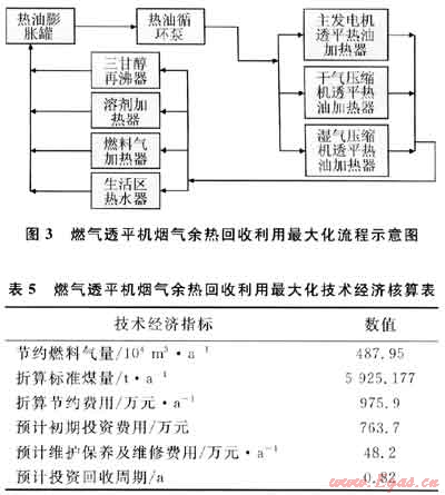 如果將這些熱源用戶全部改造成熱油換熱,并充分回收利用氣田上其他所有燃氣透平機得煙氣余熱,與本文2.3中涉及的熱油循環系統連成一體,那么將實現燃氣透平機煙氣余熱回收利用最大化,其流程如圖3所示。其相應的技術經濟核算見表5。這將會大量減少燃料氣的消耗量,提高能源的利用率,節約氣田開發生產成本,增加崖城氣田的經濟效益,應用前景廣闊。