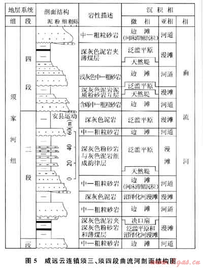 河流沉積體系主要分布于川中前陸隆起帶近物源的中、南部的須二-須六段,平面分布受南高北低的古地形控制,辮狀河和曲流河都有發育,以前者為主,但以后者更典型。