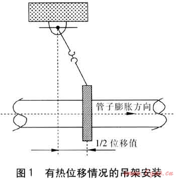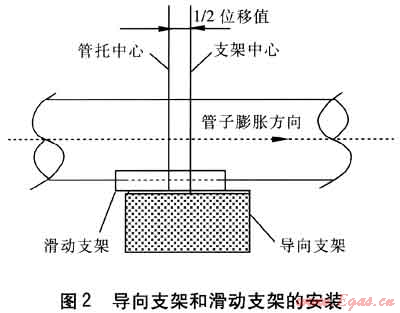 ⑥ 管道波紋管補償器在安裝前要按照使用說明進行預拉伸,安裝方向要與氣流流動方向一致且水平安裝。安裝波紋管補償器時,應設臨時約束裝置,待管道安裝固定后再拆除臨時約束裝置。管道安裝時,應及時固定和調整支、吊架。支、吊架位置應準確,安裝應平整牢固,與管道接觸應緊密。有熱位移的管道,吊點應設在位移的相反方向,按位移值的1/2偏位安裝(見圖1)。固定支架應按設計文件要求安裝,并應在補償器預拉伸之前固定。導向支架或滑動支架的滑動面應潔凈平整,不得有歪斜和卡澀現(xiàn)象。導向支架和滑動支架的安裝位置應從支承面中心向位移反方向偏移,偏移量應為位移值的1/2(見圖2)。