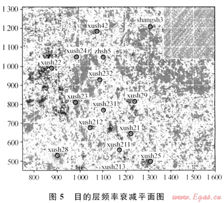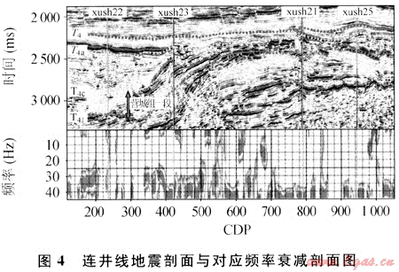 頻率衰減是指地震波在地下巖層中傳播時總能量的損失,包括波前發散引起的振幅衰減和地層非完全彈性引起的地震波振幅的吸收衰減,屬于介質內在的屬性。不同巖層對地震波具有不同的吸收程度,地層的吸收作用越強,地震波的高頻成分衰減越快;反之亦然。理論研究表明,在地下巖層中,如果孔隙發育,充填油、氣、水(尤其對于含氣的情況)時,地震反射吸收系數增大,高頻成分吸收衰減加劇,含油氣地層吸收系數比相同巖性不含油氣地層高幾倍甚至超出一個數量級[7~8]。因此,可以利用經過目的層前后地震波的頻率衰減屬性進行儲層油氣檢測。