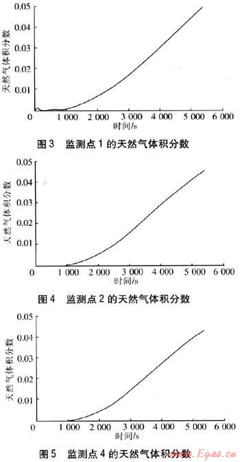 監測點1、2、4的模擬結果見圖3~5,監測點3、5、6、7的天然氣體積分數曲線與圖4、5相似。