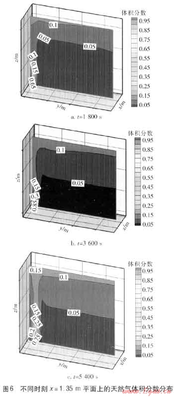 模擬了天然氣泄漏后,x=1.35m平面、z=1m(距離地面1m)平面、z=1.6m平面上的天然氣體積分數隨時間t的變化規律。天然氣泄漏1800、3600、5400s后x=1.35m平面上的天然氣體積分數分布見圖6。由模擬結果可知,天然氣泄漏擴散后的體積分數隨與地面垂直距離的增大而增大。不同時刻天然氣泄漏擴散的形態基本相似,但天然氣的體積分數和所覆蓋的危險區域變化較大。