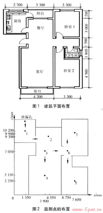 以該二室一廳建筑內的廚房天然氣泄漏為例,建筑平面布置見圖1,尺寸單位為mm,房間高3.3m。按照該建筑建立物理模型,天然氣泄漏點設定在廚房地表面,在室內設置7個監測點,監測點的布置見圖2,監測點距地面1.6m,圖2中的箭頭表示天然氣泄漏后的擴散方向。設室內環境溫度為27℃,壓力為一個標準大氣壓,墻壁為絕熱,房間處于封閉狀態。假定天然氣泄漏孔的直徑為25mm,泄漏速度為3m/s。