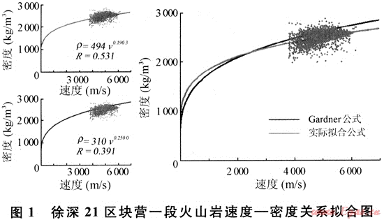 波阻抗等于密度和速度的乘積,而速度與密度存在一定的關系(如Gardner公式)[9],因此可以通過擬合密度與速度的關系,將這種關系代入波阻抗體中,分離出密度來。但不能簡單地套用Gardner公式,因為Gardner公式是國外地球物理學工作者通過對美國墨西哥灣地區淺層海相地層中巖心樣品分析得到,它更適合于沉積巖,對于徐深氣田徐深21區塊深層火山巖,應該根據實際情況擬合適用于該區的公式模型。通過該區塊營一段火山巖地層的測井資料,得到如下公式模型(圖1):ρ=494v0.1903,相關系數為0.531。然后,通過Jason軟件Function模塊編寫函數,將約束稀疏脈沖波阻抗體轉換成密度體。