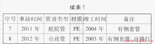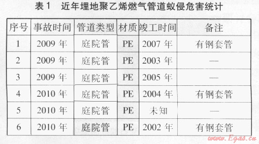 從近年埋地PE燃氣管道蟻侵危害統(tǒng)計(見表1)來看,受白蟻蛀蝕侵害的管道常具有以下顯著特點:大多為庭院管;全為PE管道;受損管道外大多加裝了鋼質套管;管道大多投入運行5 a以上。