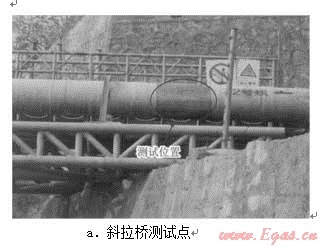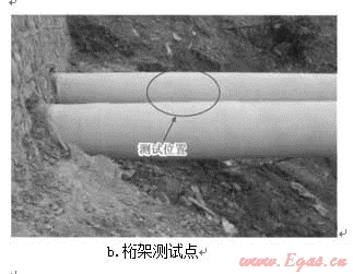 在中國石化中原油田分公司普光氣田公司(以下簡稱普光氣田)的協助下,根據測試位置的要求,最終選取了斜拉橋和桁架處作為管道積液測試位置(圖5)。