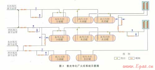 放空管網系統包括從各系列天然氣凈化裝置內的放空閥后至高低壓放空分液罐的部分。每系列裝置管廊上的高低壓放空總管經位于裝置界區的高低壓分液罐分離泄放氣中攜帶的脫硫、脫水溶劑后,匯入東西區高低壓放空管網。東區高低壓放空管網主要負責第一、二、三聯合天然氣凈化裝置、趙家壩污水站及集氣總站的放空需要,西區高低壓火炬放空管網主要負責第四、五、六聯合天然氣凈化裝置的放空需要。東西區高壓放空管網并行進入高壓放空分液系統,東西區低壓放空管網匯合成低壓放空總管后進入低壓放空分液系統。